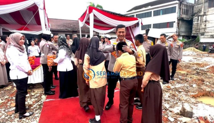 SERAMBIJAMBI.ID, KOTA JAMBI – Disela-sela Ground Breaking Peletakan Batu Pertama Satuan Pelayanan Pemenuhan Gizi Polda Jambi atau yang disebut dapur Sehat terdapat momen Kapolda Jambi Irjen Pol Rusdi Hartono disambut oleh Siswa dan siswi Sekolah Dasar saat tiba di lokasi acara, Rabu (19/2/2025).