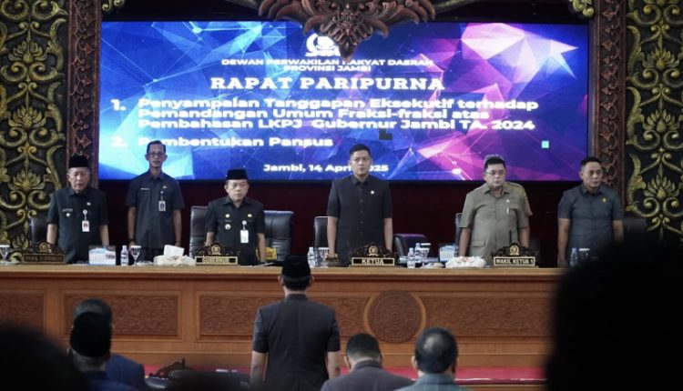 SERAMBIJAMBI.ID, JAMBI – Gubernur Jambi Dr. H. Al Haris, S.Sos. MH menyampaikan, sebagaimana diketahui bahwa pada Rapat Paripurna DPRD pada tanggal 9 April 2025, Fraksi-fraksi Dewan telah menyampaikan Pandangan Umum terhadap Laporan Keterangan Pertanggungjawaban (LKPJ) Gubernur Jambi Tahun 2024. Hal tersebut disampaikan Gubernur saat memberikan Jawaban Pemerintah Atas Pandangan Umum Fraksi-Faraksi DPRD Provinsi Jambi pada, terhadap Laporan Keterangan Pertanggungjawaban (LKPJ) Gubernur Jambi Tahun 2024, bertempat di Ruang Sidang Utama Gedung Dewan Perwakilan Rakyat (DPRD) Provinsi Jambi, Senin (14/04/2025) pagi.