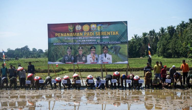 Komitmen Sukseskan Program Swasembada Pangan Nasional, Kodim 0416/Bute Ikuti Penanaman Padi Serentak Se-Provinsi Jambi
