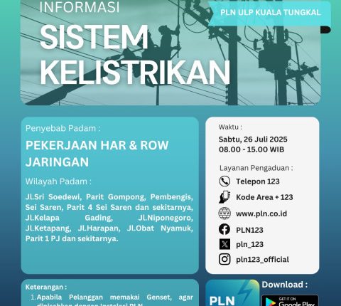 Dalam proses pekerjaan tersebut, PLN akan melakukan pemadaman listrik sementara waktu pada Sabtu, 26 Juli 2025. Pemadam listrik akan dilakukan selama 7 jam dari pukul 08.00 WIB sampai dengan 15.00 WIB.