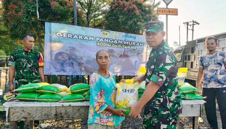 SERAMBIJAMBI.ID, TANJAB BARAT – Wujud nyata dukungan terhadap stabilitas harga pangan, Koramil 419-02/Tungkal Ulu kembali menggelar penyaluran beras murah melalui Program Gerakan Pangan Murah (GPM). Kegiatan yang berlokasi di Simpang 10 RT 02, Desa Pematang Pauh, Kecamatan Tungkal Ulu, Kabupaten Tanjung Jabung Barat ini sukses menyalurkan beras Bulog kepada masyarakat dengan harga terjangkau.