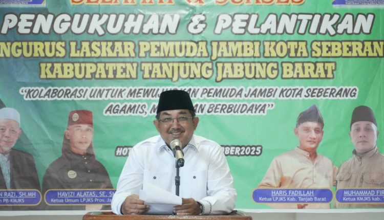 SERAMBIJAMBI.ID, TANJAB BARAT – Bupati Tanjung Jabung Barat, Drs. H. Anwar Sadat, M.Ag., menegaskan bahwa membangun kemajuan daerah memerlukan kolaborasi erat dari seluruh elemen masyarakat. Penegasan ini disampaikan Bupati saat menghadiri acara Pengukuhan dan Pelantikan Pengurus Laskar Pemuda Jambi Kota Seberang (LPJKS) Cabang Kabupaten Tanjung Jabung Barat periode 2025–2029 di Hotel Arryadh Kuala Tungkal, Rabu (8/10).